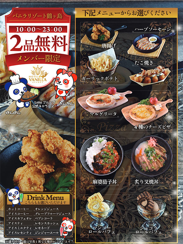 10:00~24:00の間にご注文のメンバー様は全てのメニューからお好きな2品をお選びいただけます。
