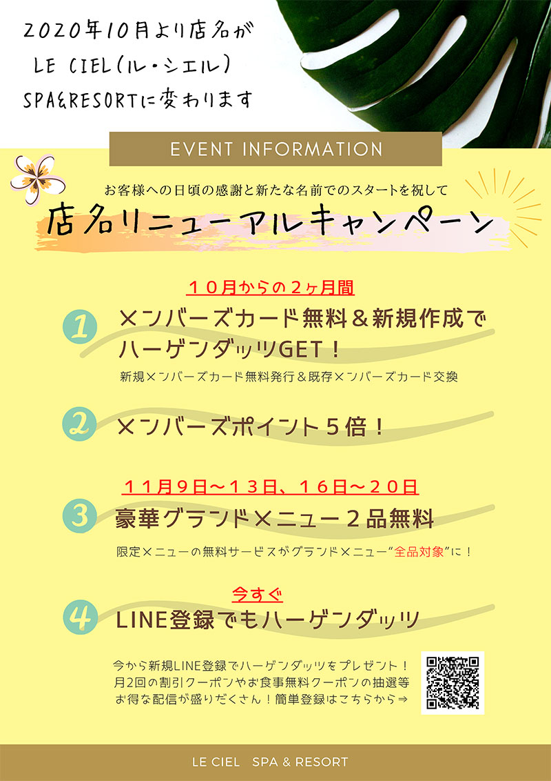 2020年10月1日より店名が「LE CIEL SPA & RESORT(ル・シエル スパ&リゾート)」に変わりました。