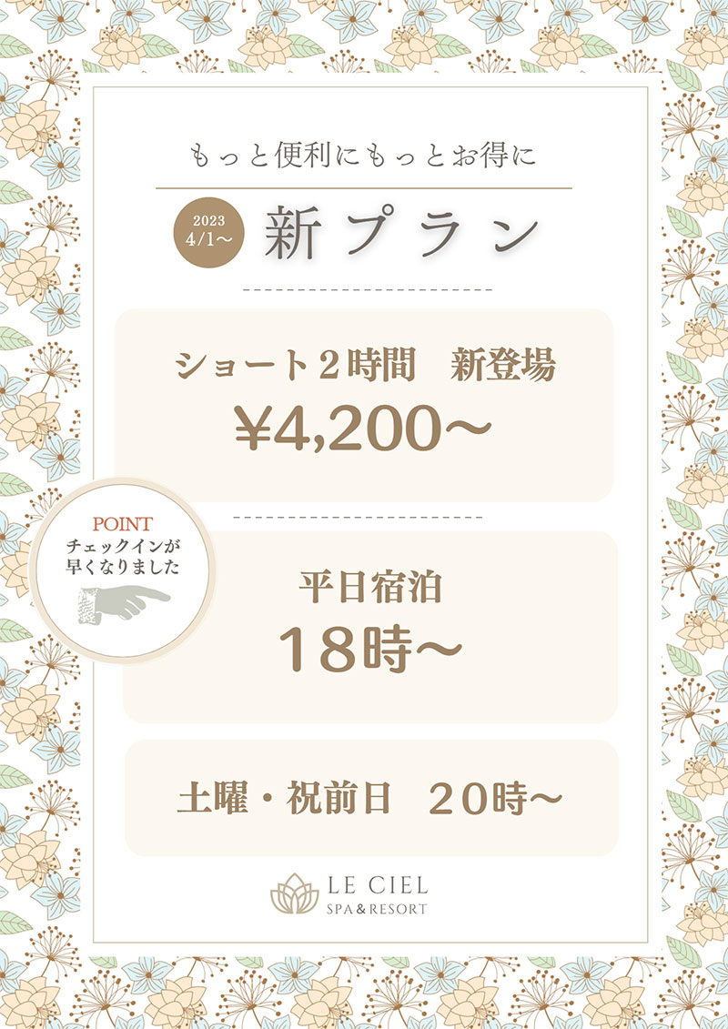 • 2023.03【4月1日スタート】新プラン開始!2時間ショートタイム等、もっと便利に♪