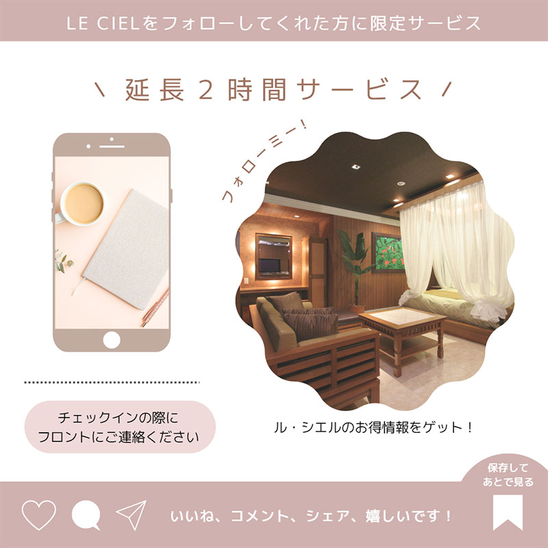 今後も最新情報、お得情報やInstagram限定サービスも配信予定です。フォローして、お得にル・シエルをご利用くださいませ。