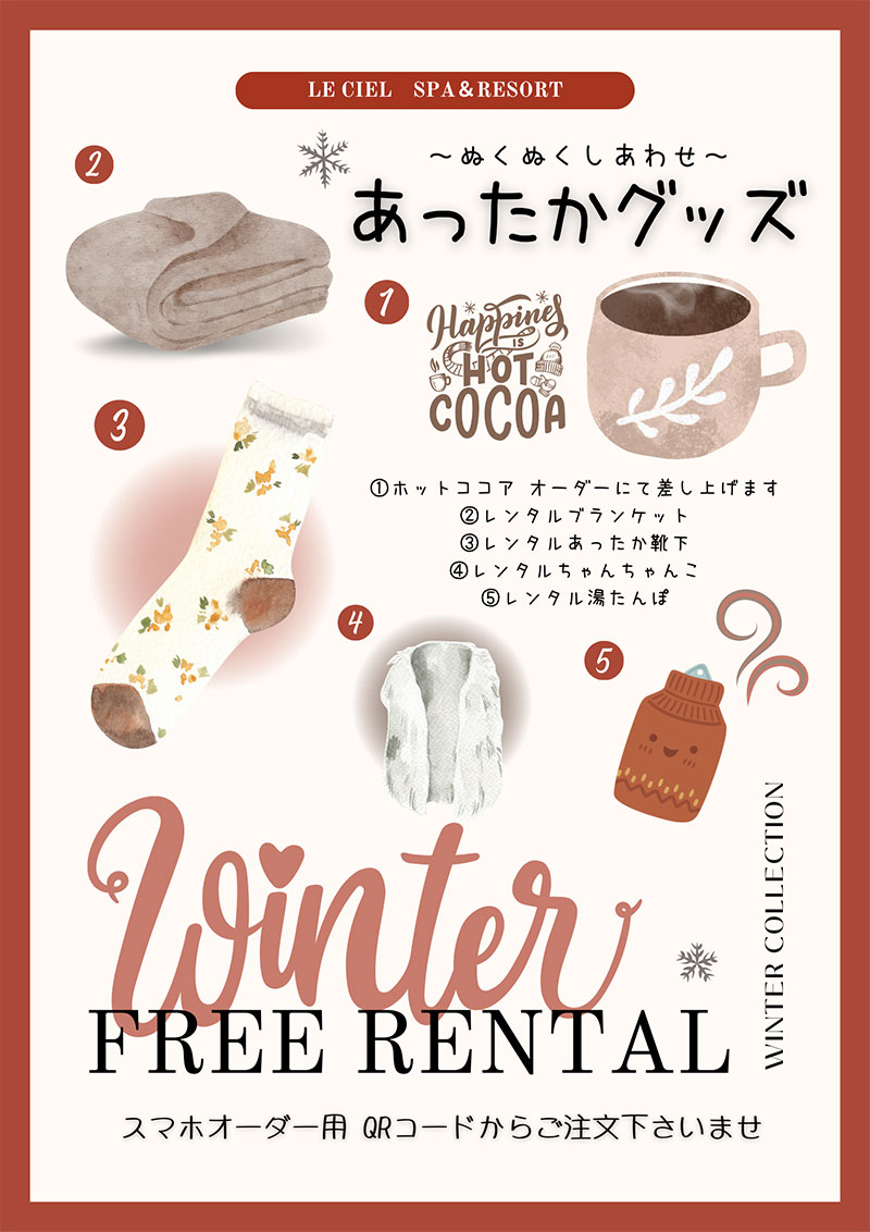 ル・シエルではお客様に心もからだもあったかくなってもらえるカワイイあったかグッズを用意しております。